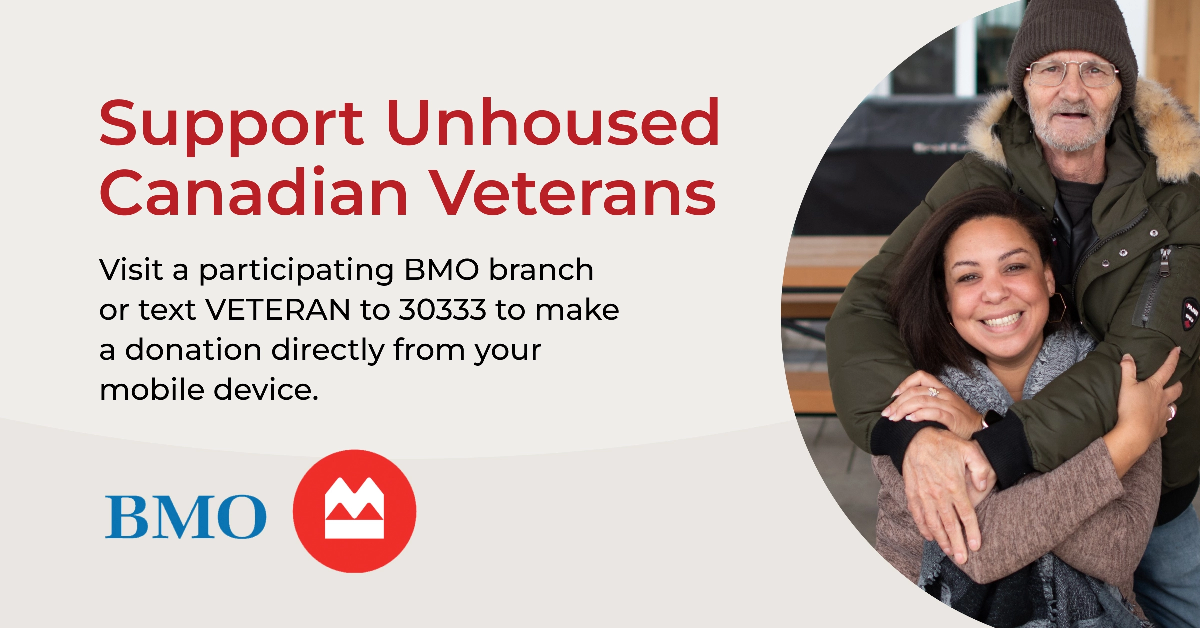From November 1 to 15, select BMO branches across Ontario and Alberta will be collecting donations to support Veterans’ House Canada’s mission — helping homeless veterans build a better future by providing permanent, affordable, and supportive housing.