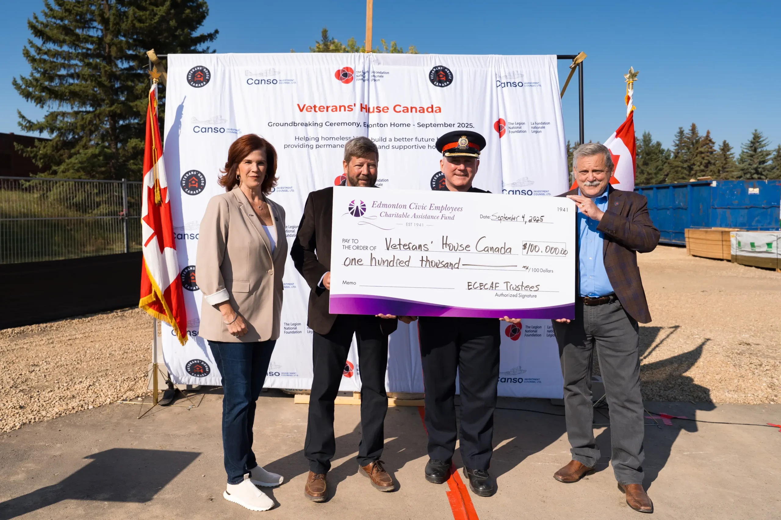 EDMONTON, Alberta (December 2025) – Veterans’ House Canada is proud to announce a $100,000 sponsorship from Edmonton Civic Employees Charitable Assistance Fund (ECECAF) to support the Community Development & Health Support Office in the future home for unhoused Veterans across Edmonton. This vital funding arrives at a key phase in the construction of 40 permanent housing units dedicated to Veterans. Derek McIntyre, representing ECECAF’s board of trustees, attended the groundbreaking ceremony in September to reaffirm ECECAF’s strong commitment to the Edmonton community and those who have served the nation.